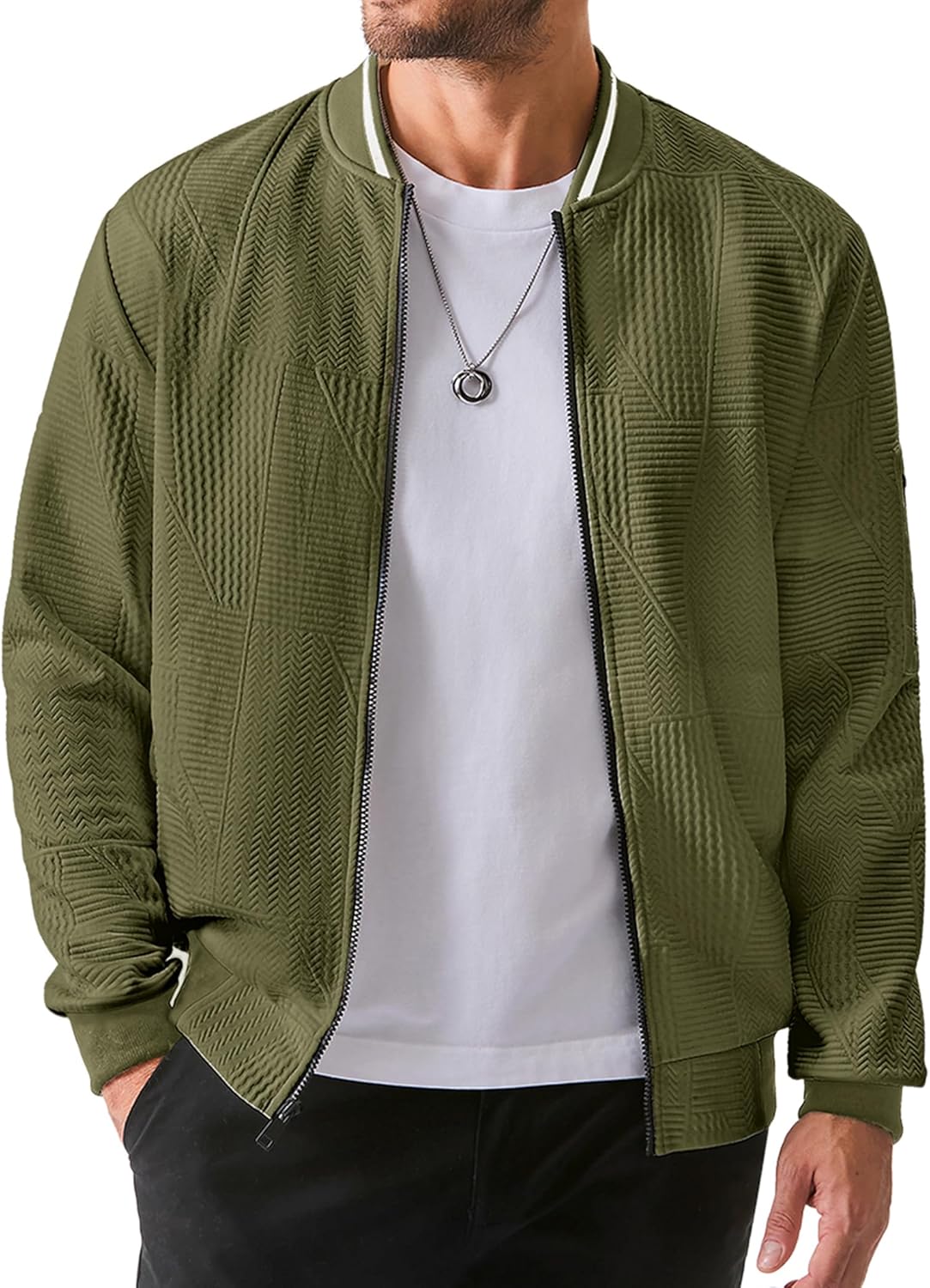 - Stylish Design: This men’s bomber jacket features a modern, sleek design with a subtle geometric pattern, making it perfect for both casual and semi-formal occasions. The contrasting black cuffs and hem add a touch of sophistication to the overall look.