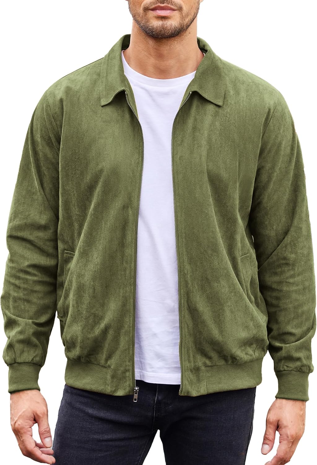 - CLASSIC DESIGN— This suede bomber jacket features a timeless bomber style with a lapel collar and full-zip front, and designed with two side pockets, which provides ample space to store essentials like your phone, keys, or wallet.