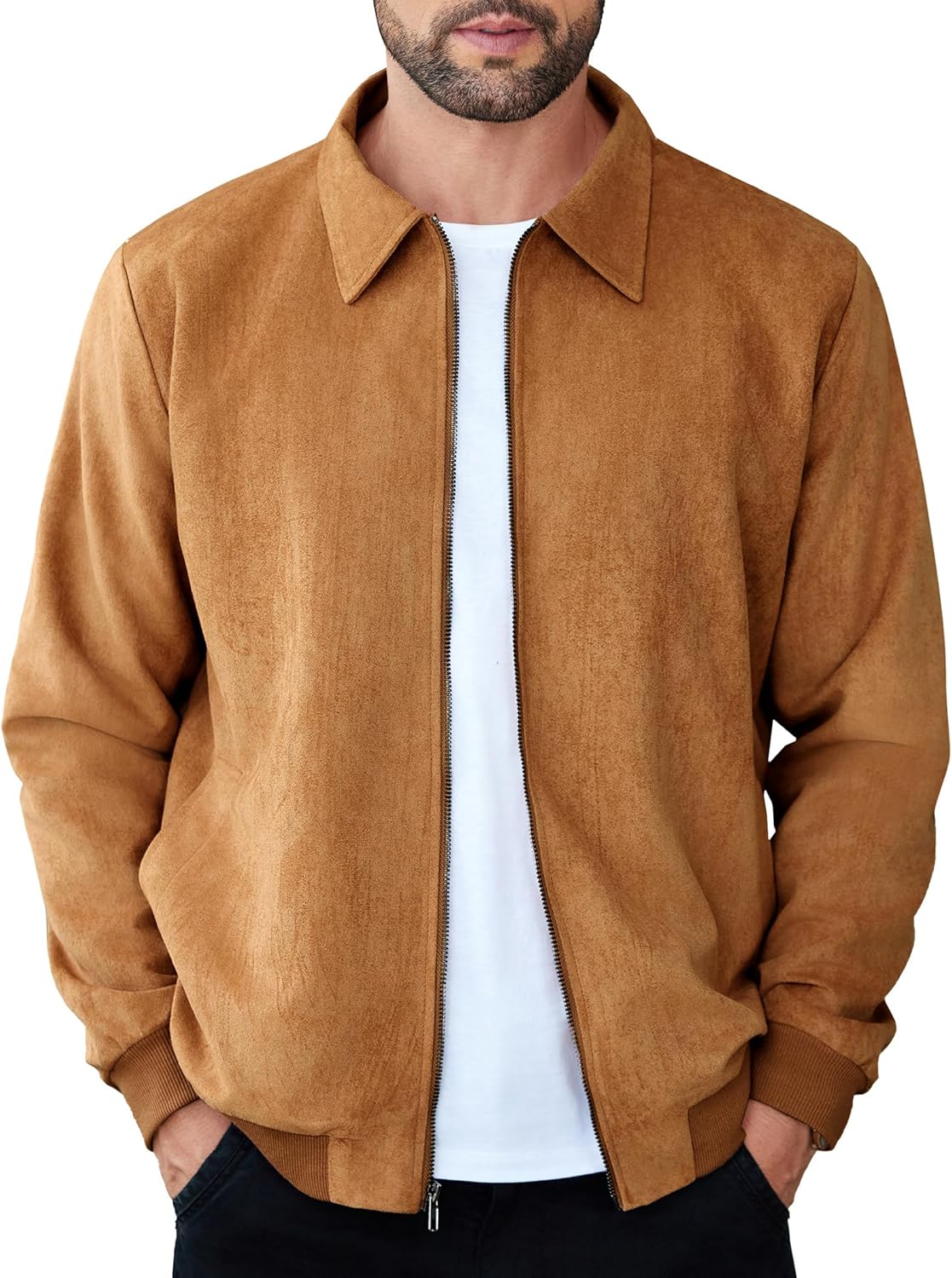 • CLASSIC DESIGN— This suede bomber jacket features a timeless bomber style with a lapel collar and full-zip front, and designed with two side pockets, which provides ample space to store essentials like your phone, keys, or wallet.